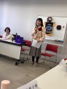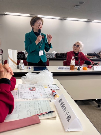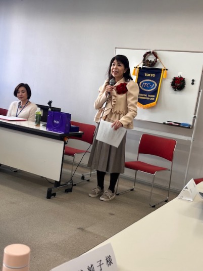 前半の「びっくりする話」or「笑いを誘う話」は、ゲストを含め全員がスピーチを披露。『私の話を聞いて!』では、温泉から上がると下着が無くなっていてビックリ仰天するも、翌朝一件落着した話や「起立、礼、着陸!」と号令した生徒会長の話などに、会場からは、へーという反応やあちこちで笑いがこぼれ、和やかな空気に包まれました。お土産の洋菓子をスピーチの賞品にと、プログラムリーダーが判断し、めったにない経験の話で大きな笑いを誘った会員にプレゼントされました。